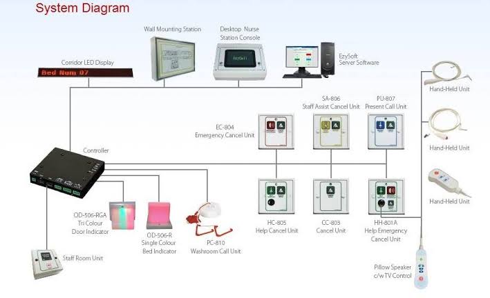 Primarily, this station is located at the patient's bedside. The button is usually on the pillow speaker. The speaker can have other functions like temperature, television, and lighting control. Other advanced functions can also be connected to the patient station to monitor bed rail position and medical equipment.
